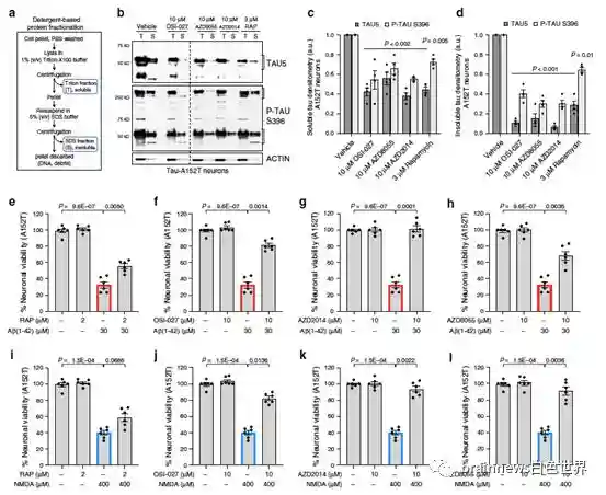 此外,在FTD病人诱导的神经元细胞中,tau蛋白的聚集往往和神经元应激障碍并存,而这种应激障碍会在淀粉样蛋白β(Aβ)和兴奋性神经递质NMDA的刺激下表现的更加显著。该团队先使用mTOR抑制剂处理携带A152T变异的神经元8小时,之后加入Aβ和NMDA,随后检测细胞活性。溶剂对照组细胞活性仅为30%,雷帕霉素处理组挽救60%溶剂对照组的细胞活性,AZD8055挽救70%,OSI-027挽救80%,AZD2014挽救100%(图2)。