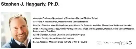 Haggarty教授目前供职于哈佛医学院神经病学系和麻省总医院基因组医学中心,是化学神经生物学实验室主任和精神病学系药物实验和诊断中心负责人。其团队主要致力于研究使神经系统能够感知、适应和响应各种内外刺激的神经可塑性的分子和细胞机制,从而发掘靶向治疗和预防神经精神疾病的药物。