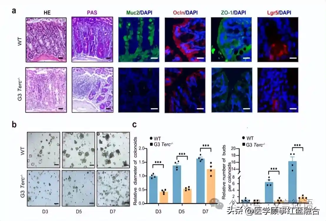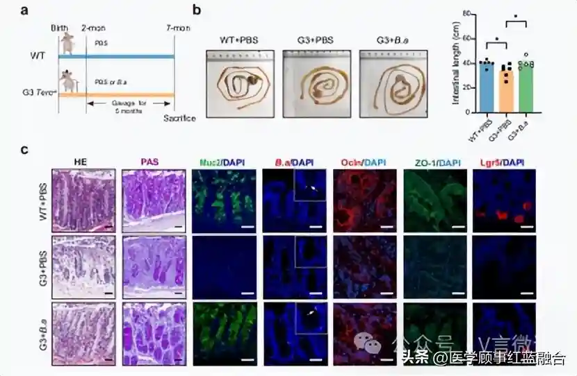 首先,作者观察到早衰型小鼠(G3Terc-/-小鼠)的结肠粘膜比野生型(WT)小鼠薄,其肠屏障受损,表现为杯状细胞减少和肠完整性相关基因(ZO-1和Ocln)表达降低。且Lgr5+肠干细胞的数量显著减少,类器官形成能力显著降低。与此同时,G3Terc-/-小鼠的青春双歧杆菌()相对丰度也低于WT小鼠。这些结果表明,衰老结肠的干性和完整性可能和青春双歧杆菌的丰度有关。