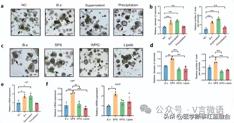 最后,作者为了深入了解热灭活的有效成分,对的粗组分进行了提取分离。当与热灭活的的分离上清液共培养时,类结肠的大小显著增加,而沉淀的裂解产物没有这种作用。作者随后用来自的上清液组分(包括可溶性多糖、全肽聚糖和脂质)进行干预。结果表明,只有可溶性多糖(SPS)能促进结肠样细胞的增殖,并能增加肠干细胞相关基因Lgr5和Ascl2的表达。这表明SPS可能是的促ISCs作用的潜在有效成分,而不是脂质和肽聚糖。