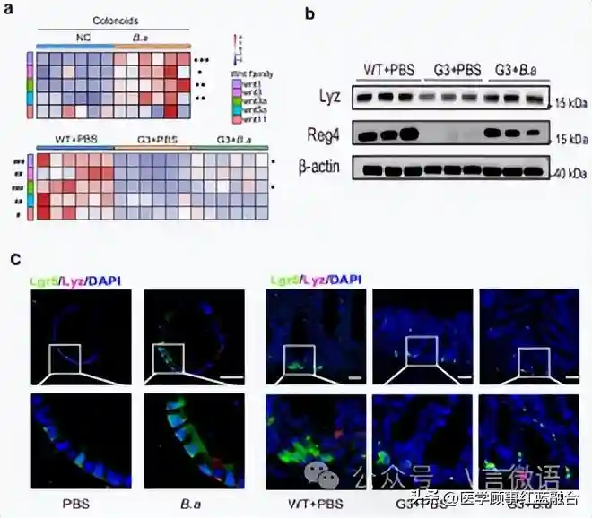 接下来作者进一步探究潘氏细胞是否参与的促ISCs作用。于是该研究检测了潘氏细胞相关基因(Lyz、Reg4、Car4、c-Kit、Bip1和Cd24)在结肠中的mRNA水平,发现上调了这些基因的mRNA表达,在G3Terc-/-小鼠的结肠组织中,Lyz和Reg4的蛋白水平也随着热灭活的介入而显著增加。免疫荧光染色也证实了Lyz和Lgr5在结肠组织中的定位,这表明可能增加位于Lgr5+干细胞旁边的潘氏细胞的数量,从而诱导ISCs再生。