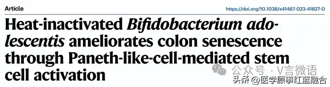 2023年9月30日,浙江大学王良静、陈淑洁、姒健敏研究员团队在NatureCommunication(IF=16.6)杂志上发表了一篇题为“Heat-inactivatedBifidobacteriumadolescentisamelioratescolonsenescencethroughPaneth-like-cell-mediatedstemcellactivation”的研究论文。该研究揭示了热灭活的青春双歧杆菌在维持肠干细胞(ISCs)再生和肠道屏障中的作用,并提出改善结肠衰老的菌群目标。