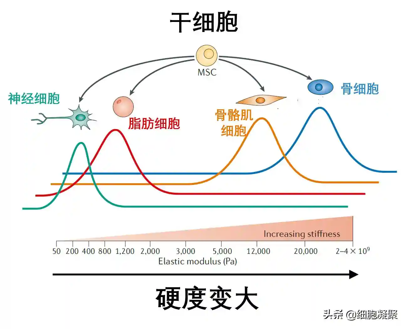 现在大部分研究表明:干细胞在硬的地方待久了,会倾向于向肌肉组织、骨组织这种硬的东西里的细胞发展;在软的地方待久了,会倾向于向脂肪或者神经细胞等软组织中的细胞发展。