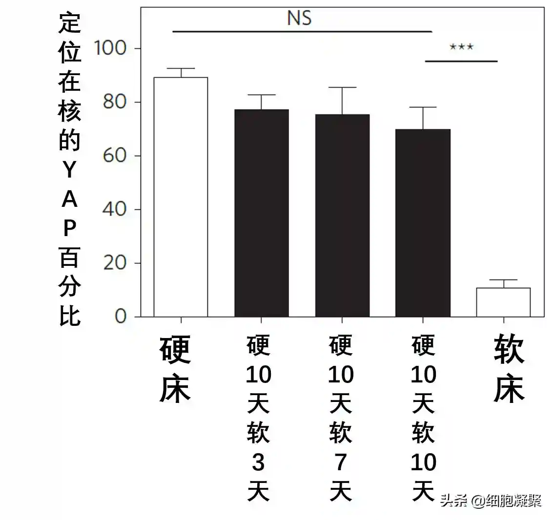 结果发现,在硬床待了10天的干细胞,即便去软床上睡10天,YAP/TAZ还是会待在细胞核,这意味着细胞虽然身在软床上,但是依然保留了在硬床上成骨分化的倾向。